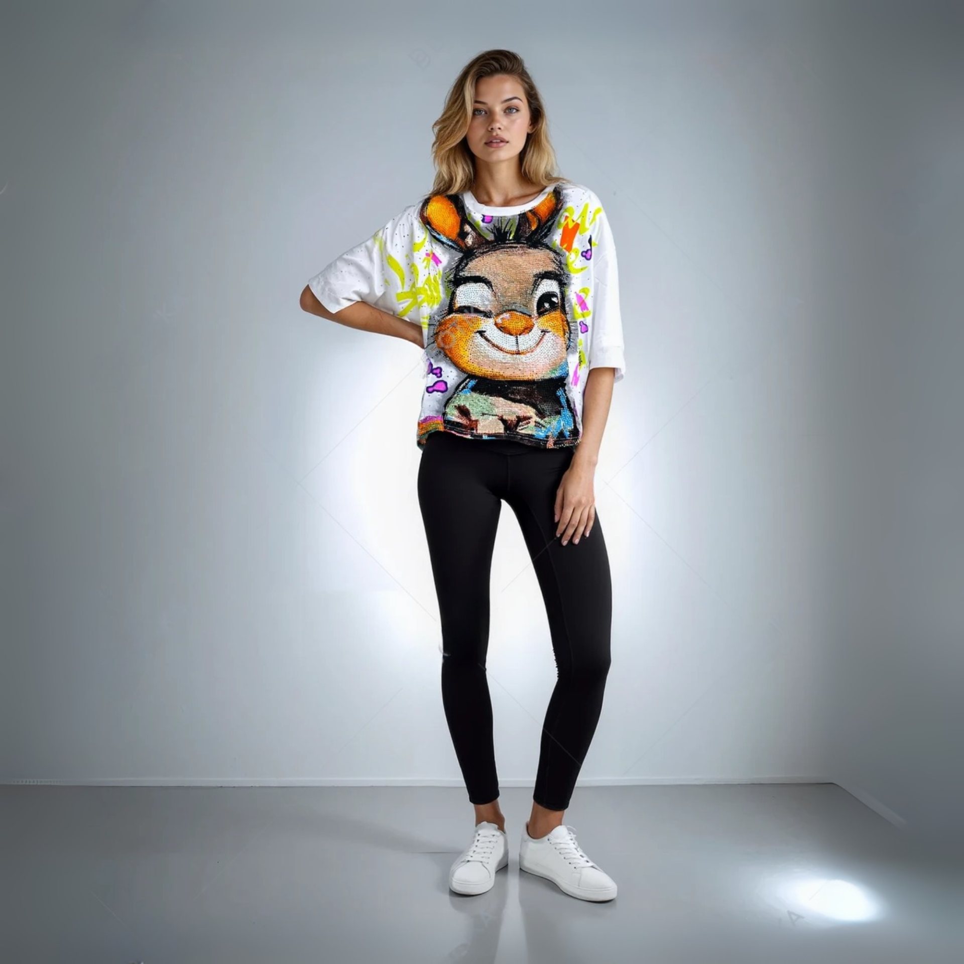 Add a fun twist to your wardrobe with this Cartoon Graphic Oversized White Top. Designed with a relaxed fit, this top features a bold cartoon print on the front, making it playful yet stylish. The breathable cotton blend fabric ensures all-day comfort, while the oversized silhouette gives you a trendy, laid-back vibe. Perfect for pairing with jeans, shorts, or leggings, this piece is a must-have for casual outings, college wear, or streetwear fashion.