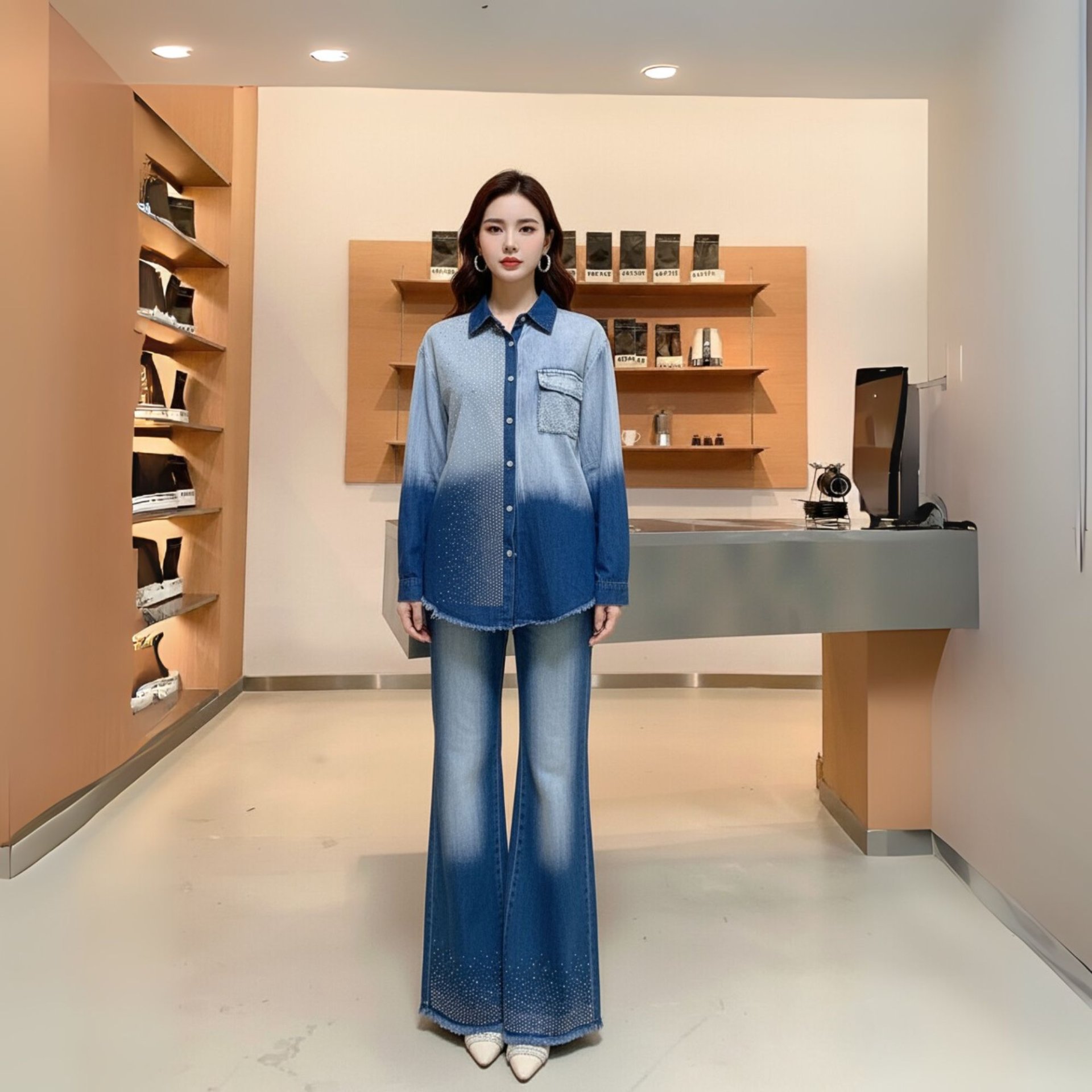 This stylish denim co-ord set features a light-to-dark ombre wash that blends effortlessly from a soft sky blue to a deep indigo blue, creating a trendy gradient effect. The button-down denim shirt comes with a front pocket and delicate stud embellishments for added sparkle. It has a relaxed fit with raw-edged hems, giving it a chic and modern look. Paired with high-waisted flared jeans, the bottoms follow the same ombre wash with subtle fading on the thighs and crystal-studded detailing at the hem, adding a touch of elegance. The flared cut elongates the legs, making it perfect for both casual outings and semi-formal occasions. Finished with pointed-toe heels, this look blends comfort with effortless glamour.