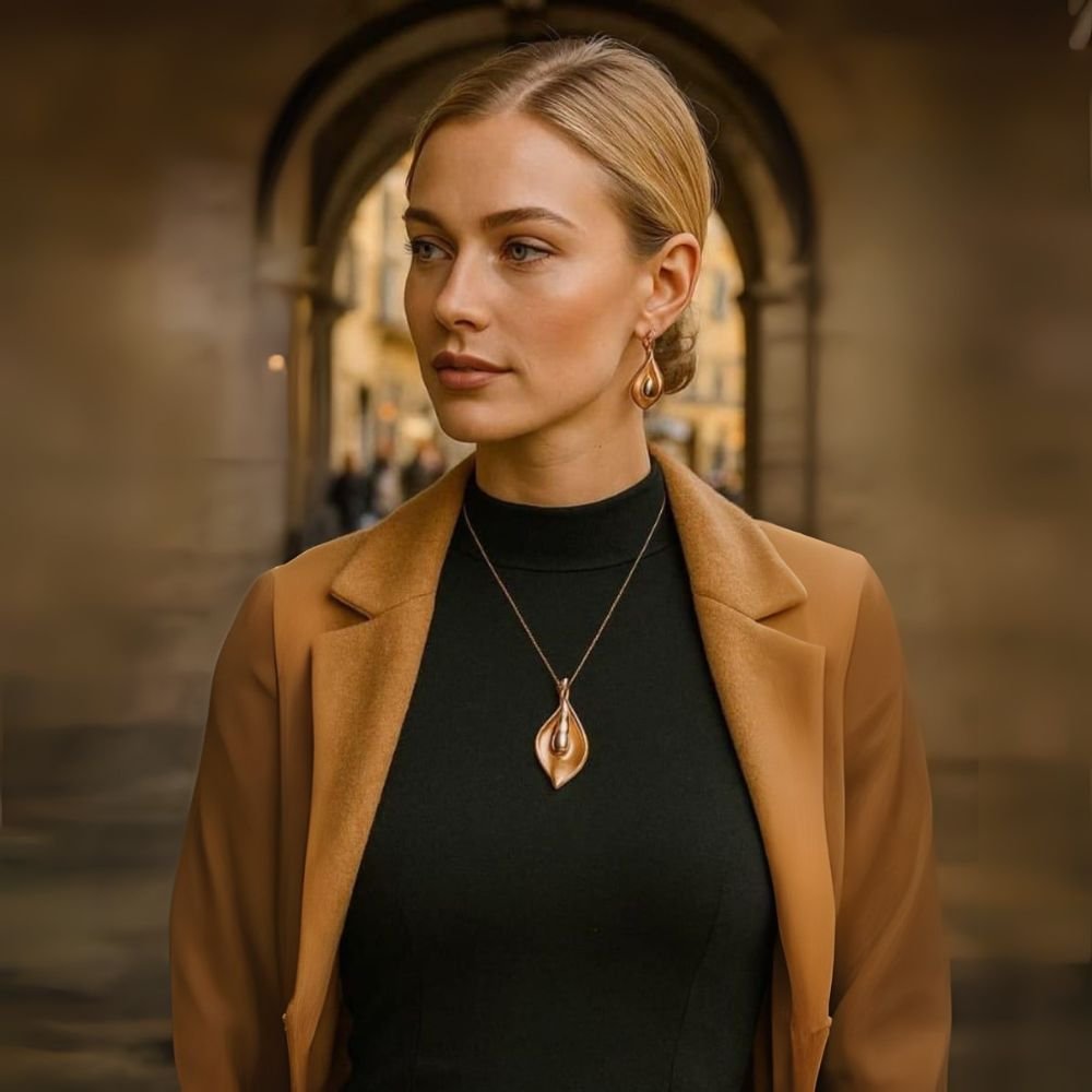 A beautiful blonde woman with her hair elegantly pulled back gazes thoughtfully off to the side. She's dressed in a chic, black high-neck top, which is complemented by a sophisticated camel-colored jacket draped over her shoulders. The focal point of her outfit is a stunning, abstract metal jewelry set: a prominent, leaf-shaped pendant hangs on a delicate chain, perfectly matched by a pair of coordinating teardrop earrings. She stands within a historic stone archway, with the blurred architecture of an old European street visible in the background, adding a sense of timeless elegance to the portrait. The soft, natural light highlights her features and the golden tones of her jewelry and jacket.