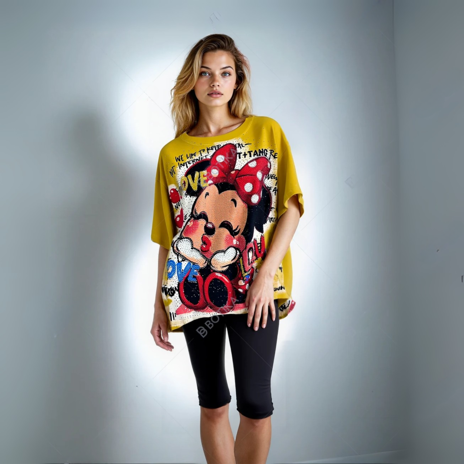 Apne casual wardrobe mein thoda fun aur fashion add kijiye is oversized Minnie Mouse graphic T-shirt ke saath. Mustard yellow base pe bold cartoon print aur funky text detailing isse ek playful aur trendy look deti hai.